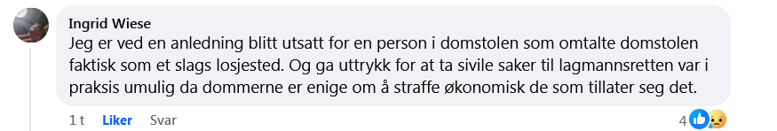 Det er også min erfaring. Jeg har aldri vunnet noe i norsk domstol. Det synest at vi skal skremmes fra systemet med sakskostnads straff. Jeg opplever at systemet virker disiplinerende gjennom trusselen om ekstreme sakskostnader, som om enkelte parter skal skremmes bort fra å søke rett. Enkelte mennesker synes å være utpekt til å tape, uavhengig av hva bevisene faktisk viser.