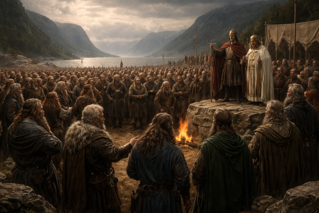 Vestlandsluften lå tung over tingvollen, som om havet selv hadde krøpet inn på sletten og lagt seg som en usynlig hinne over mennene som stod samlet. Ingen visste ennå hva ettertiden ville kalle denne dagen. Ingen visste at ord som ble sagt her, siden skulle sies med andakt, med vrede, med ærefrykt eller med hat. Men alle kjente vekten av det som nærmet seg.